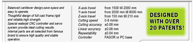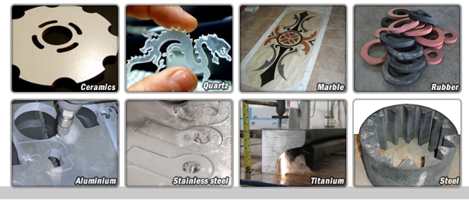 Materials can be cut include, but are not limited to, all metals and alloys, stone, marble and ceramics, composites, corian, wood, glass, acrylics, resins, silicones, plastics, foams, carpet and felts. Waterjet machine can also cut laminated dissimilar materials which can often be very hard to cut using conventional methods.