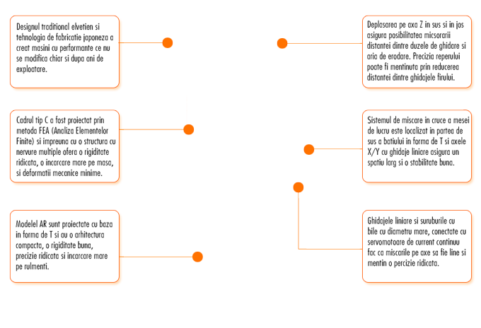 Sistemul ranforsat de deplasare al mesei de lucru este amplasat pe batiul in forma de T, iar ghidajele liniare de pe axele X, Y asigura un spatiu de lucru larg, stabilitate buna si rezistenta marita